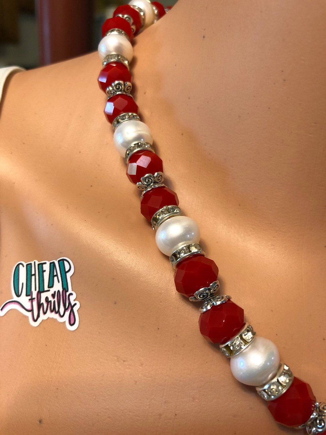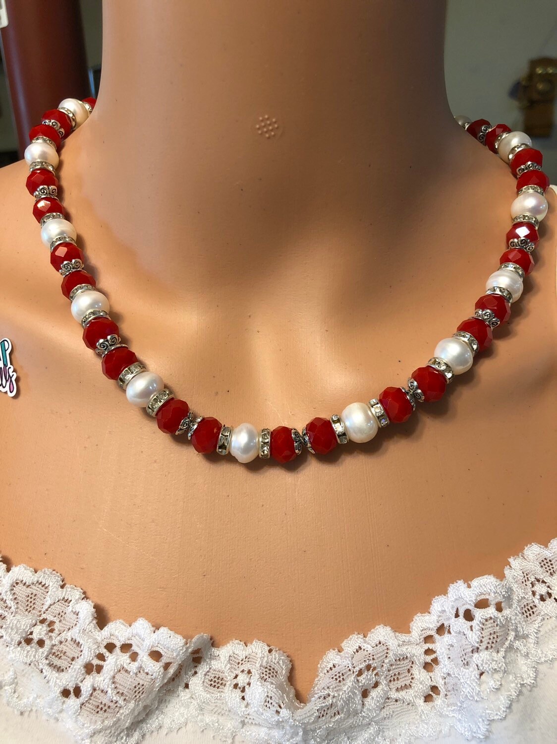 Handmade beaded 19 inch long necklace of pearl, crystals and red faceted beads. It is held together with a fancy flower lobster claw clasp