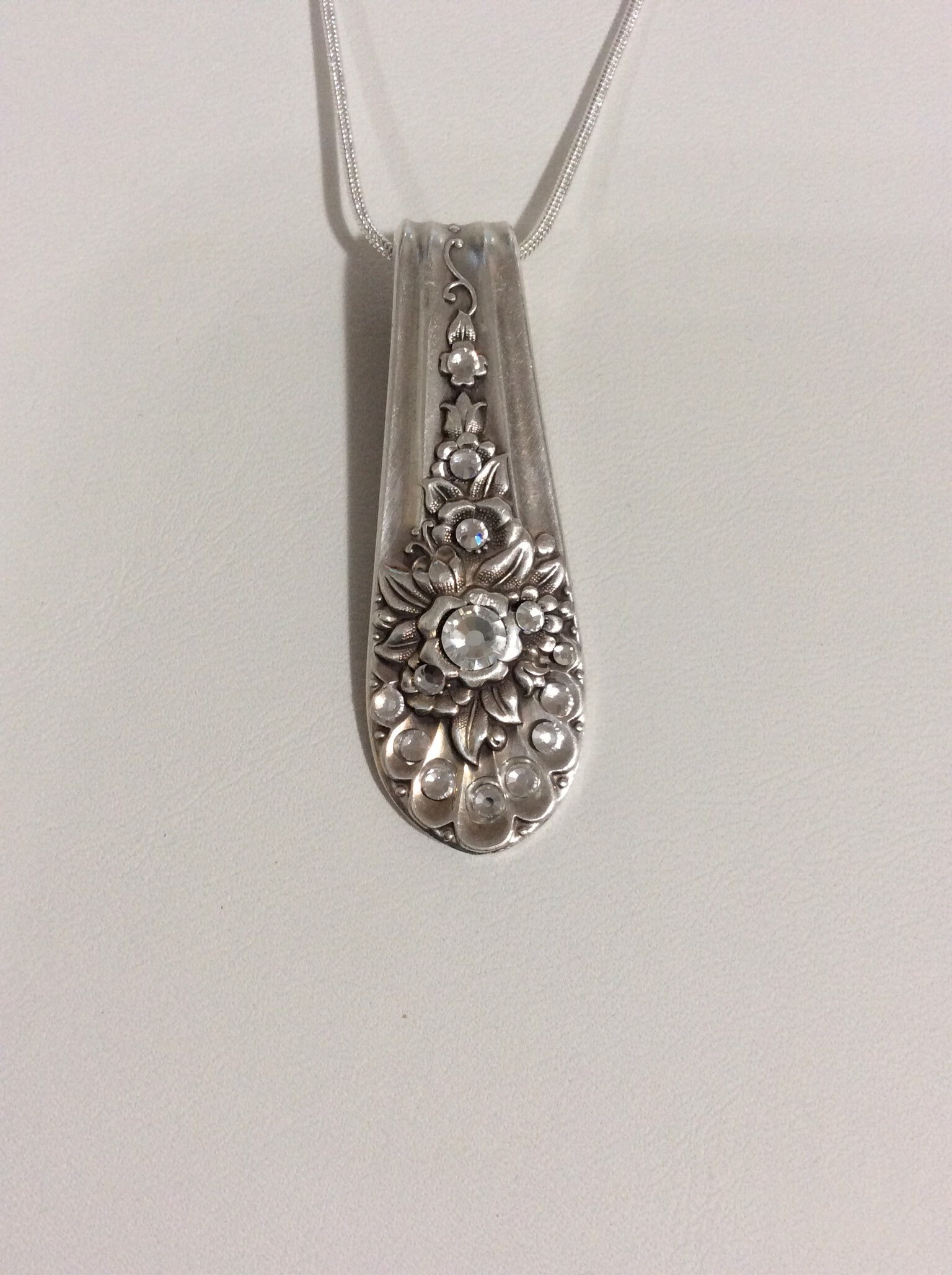 Recycled and handmade spoon handle necklace made from antique Rogers silver plate Jubilee pattern circa 1953. This is with embellishments of clear Swarovski crystals and is just wonderful in it’s natural beauty. You pick your length of 1mm silver snake chain with lobster claw clasp. The default length will be 18 inches if a choice is not specific. Each of the major shipping services has a deadline that packages must be shipped by in order to arrive by Christmas Day. Check out the cutoff dates for each major carrier. I will try to work with customers to aid in Christmas delivery.