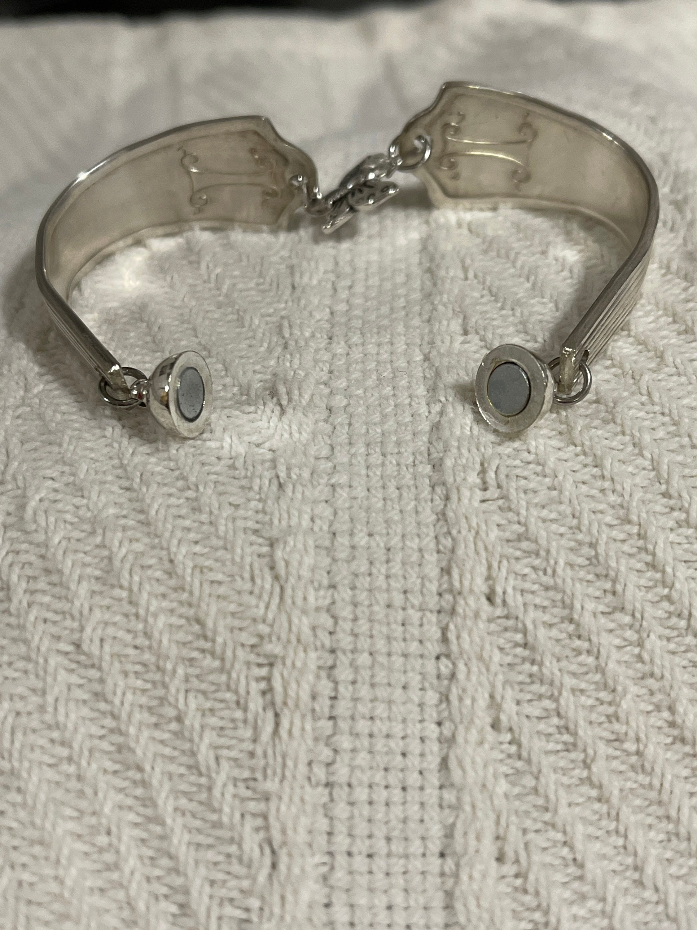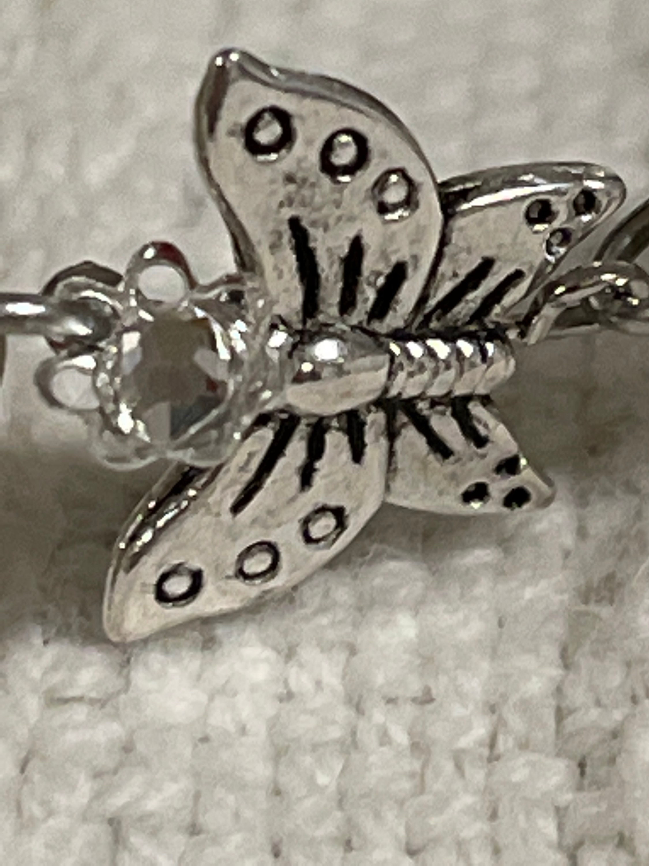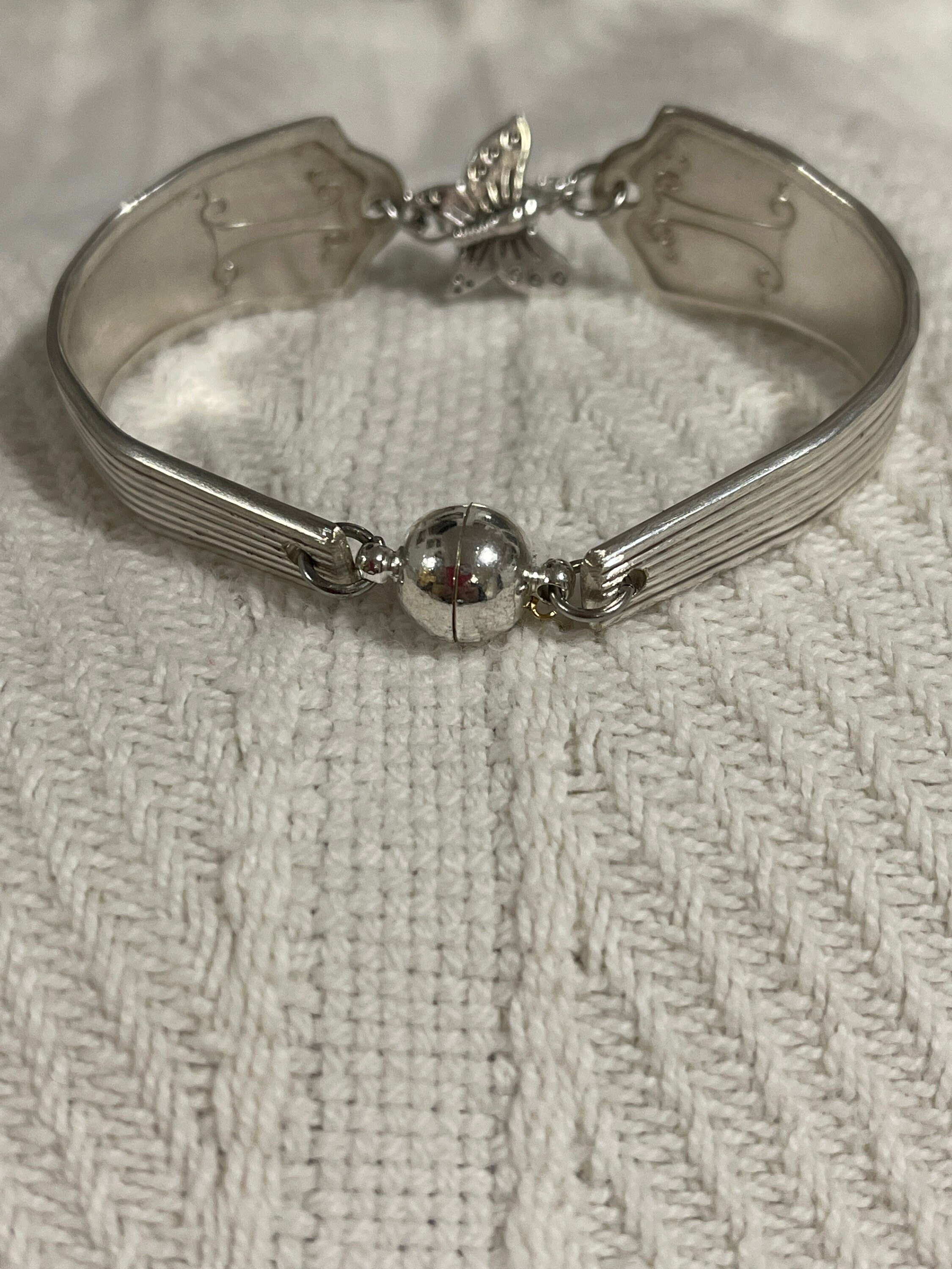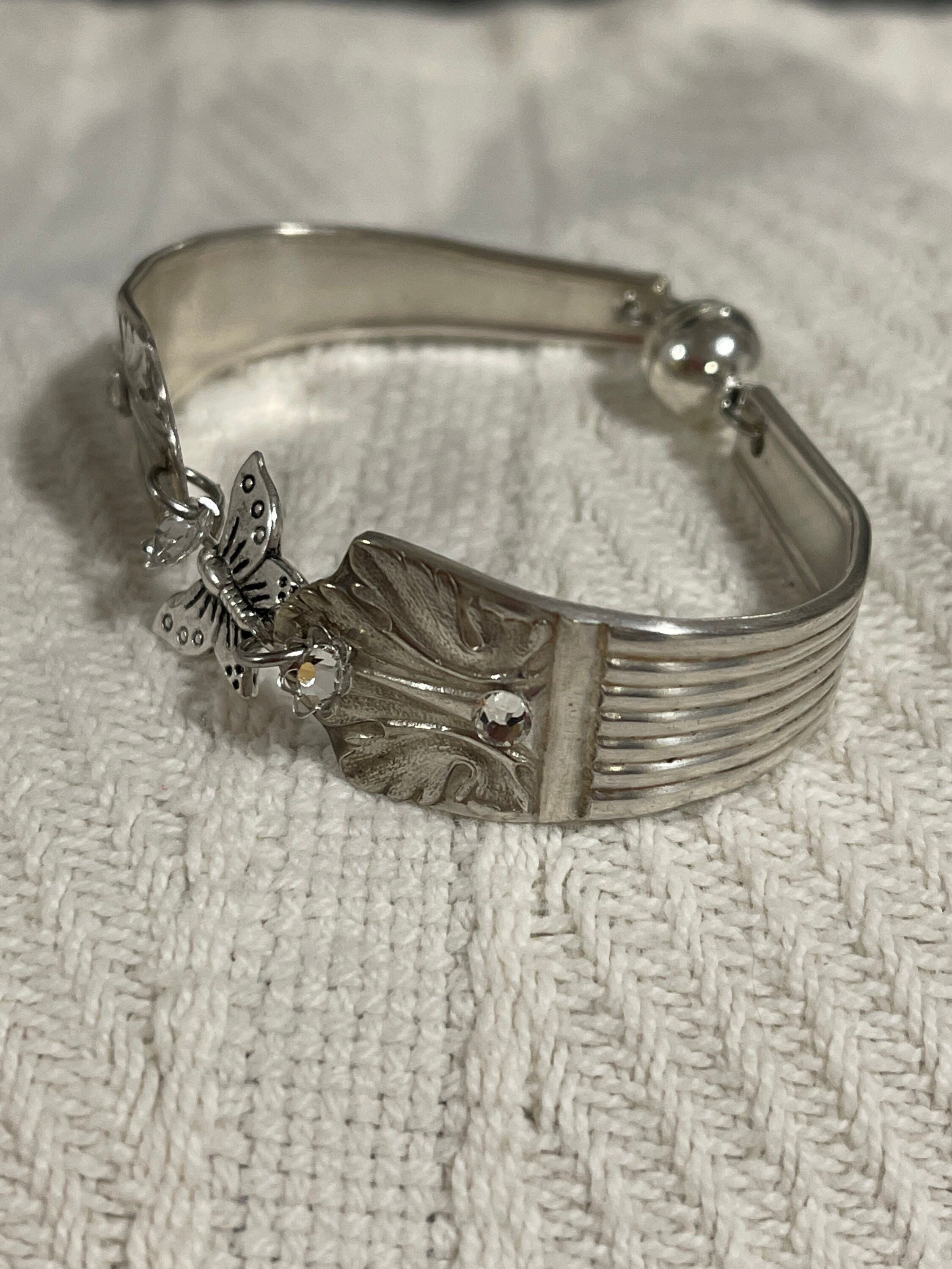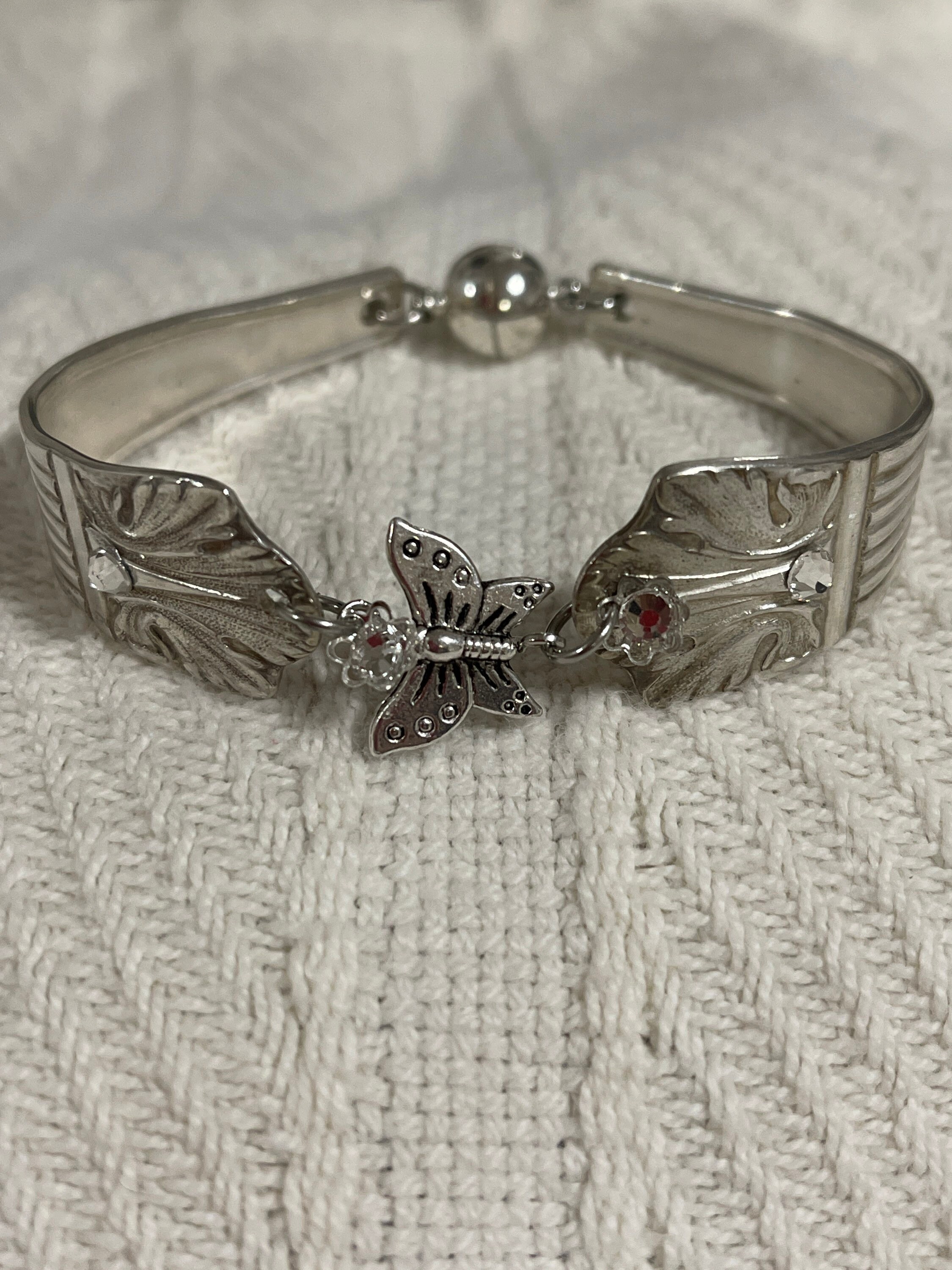 Handmade bracelet of spoon handles with butterfly connector forming spoons into a bracelet. Clear Swarovski crystals have been placed on the spoons and near butterfly as small dangles. The clasp is a round silver plate magnetic clasp. This bracelet will fit a 6.5-7 inch wrist. If you need it larger just message me with what size you need. Keep in mind this could have small imperfections due to recycled spoons being used in the piece.